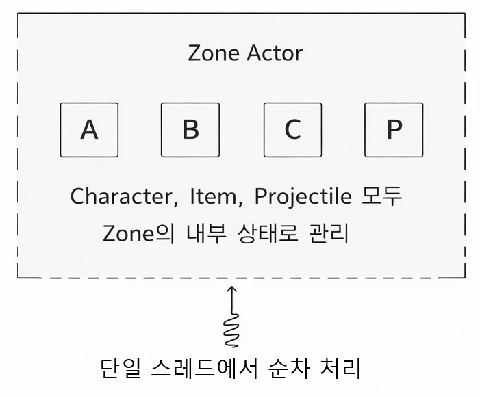 Zone 내의 모든 객체가 같은 Actor에 속하므로, 객체 간 상호작용이 일반적인 메서드 호출과 같습니다. 메시지를 주고받을 필요 없이 직접 상태를 읽고 쓸 수 있습니다.